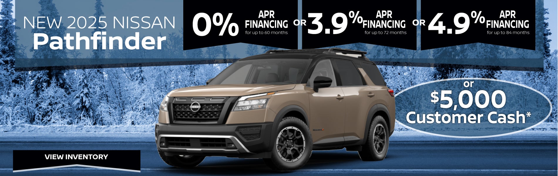 *Disclosures- New 2025 Nissan Pathfinder. Well-qualified buyers may choose either 0.0% APR financing for 60 months or 4.9% APR financing for 84 months or 2.9% APR financing for up to 72 months on a new 2025 Nissan pathfinder from new dealer stock when financed through Nissan motor acceptance company (NMAC). Example: $16.67 per month per $1,000 financed at 0.0% for up to 60 months / OR $14.09 per month per $1,000 financed at 4.9% for up to 84 months or $15.60 per month per $1,000 financed at 3.9% for up to 72 months on all new above-noted vehicles in dealer stock. Actual down payment may vary. Subject to residency restrictions. Subject to NMAC credit approval. Not all buyers qualify. $5,000 retail customer cash available to customers who purchase a 2025 Nissan Pathfinder from new dealer stock. Offer not compatible with NMAC special APR or special lease programs. Contact dealer for details offer excludes tax, tag, title, registration, dealer installed accessories, and a $799 dealer fee.